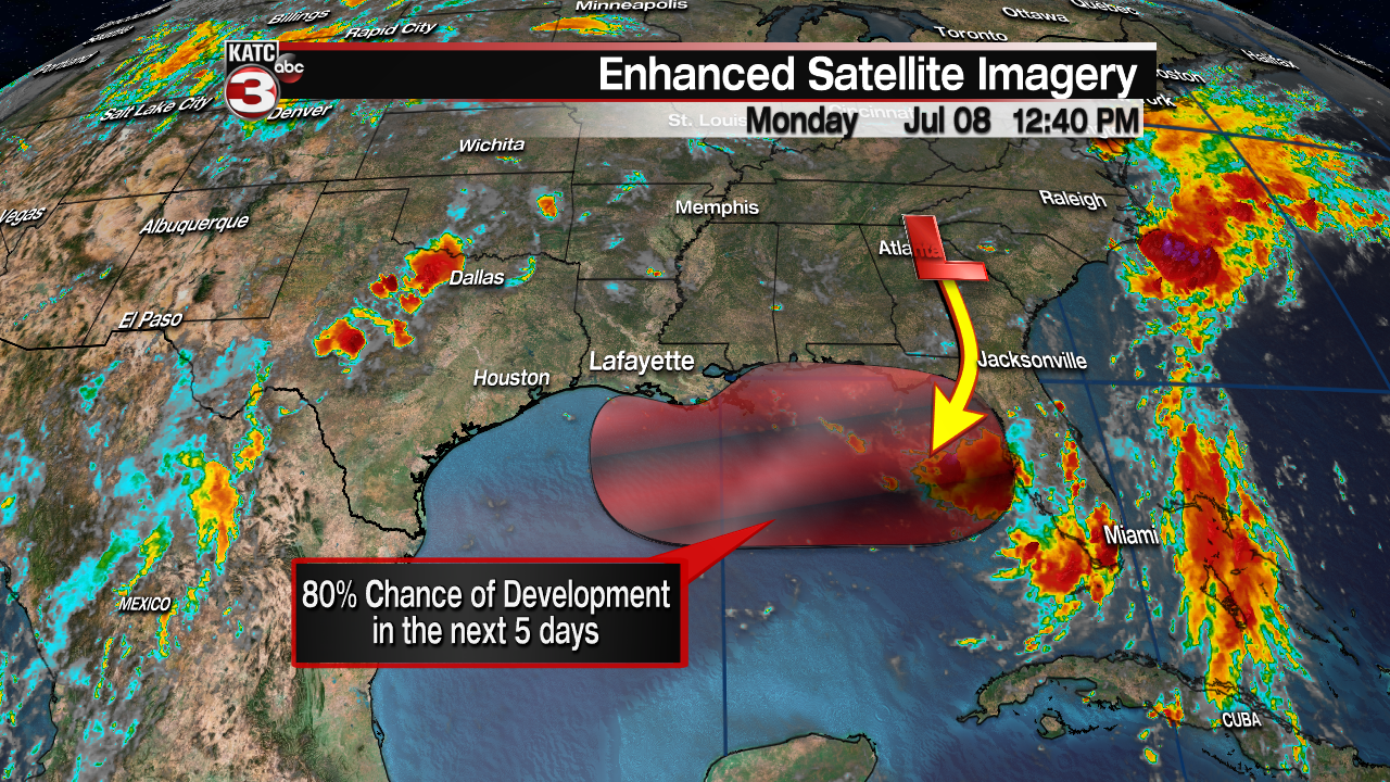 As of 1PM Monday afternoon the National Hurricane Center has increased the chance of tropical development in the Gulf over the next 48 hours to 30% while there continues to be an 80% chance a disturbance forms in the next 5 days.