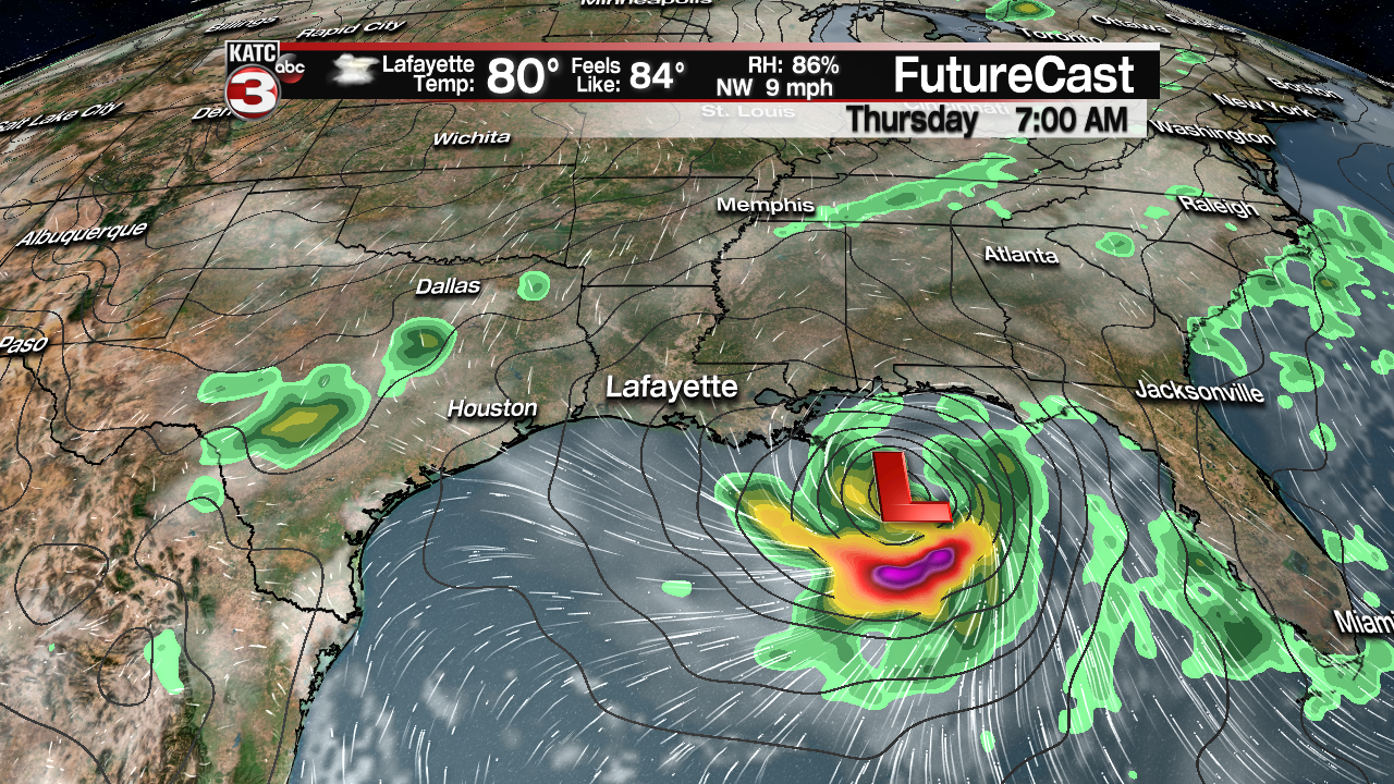 But the big takeaway today is with the potential track further to the west towards the Texas coast that could cause more of an impact for Acadiana as it would put us on the eastern side of the storm, which is the sloppy side of tropical systems, meaning we could see the possibility of heavy rains and coastal storm surge of 2-4+ feet.