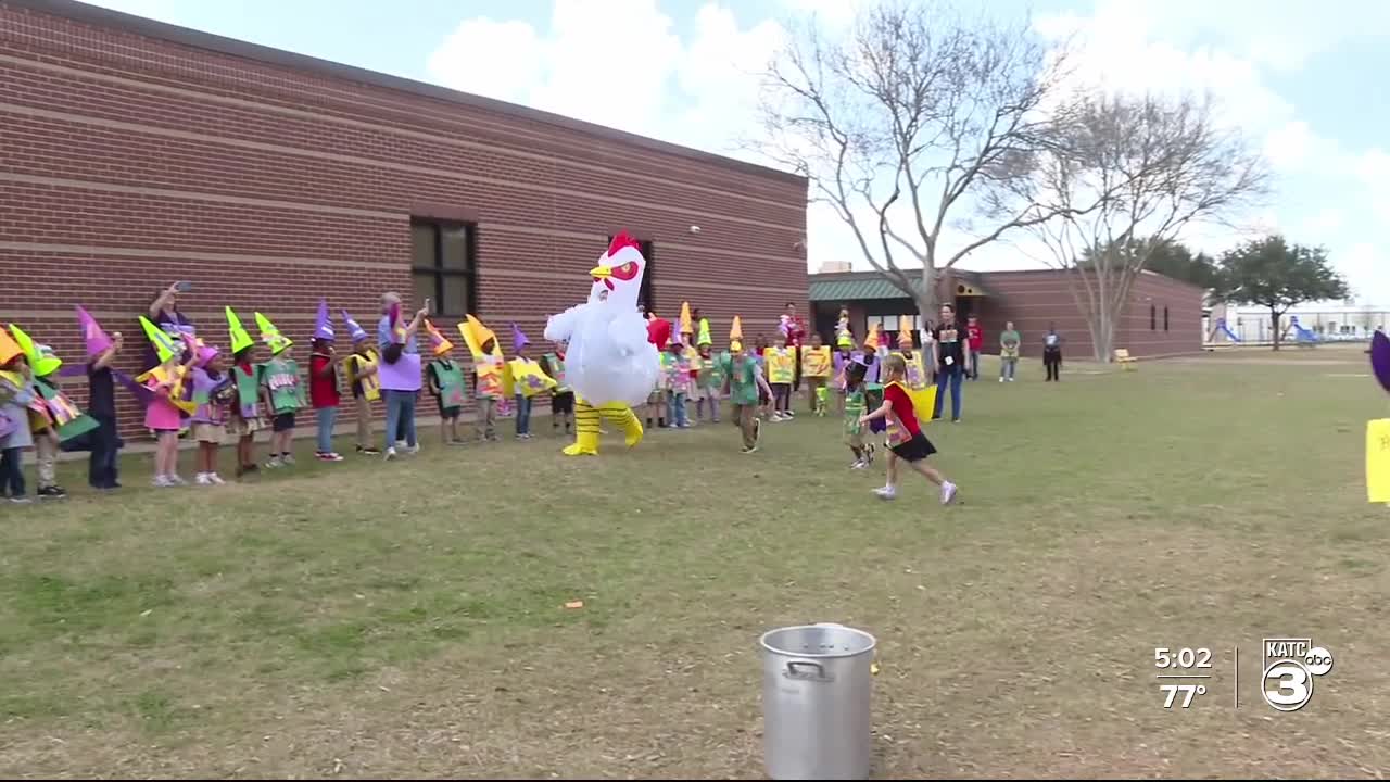 LAFAYETTE PARISH — Kindergarten students at J. Wallace James Elementary School celebrated Mardi Gras with their annual "Chicken Chase" earlier today, where teachers dressed as chickens and students tried to catch them.