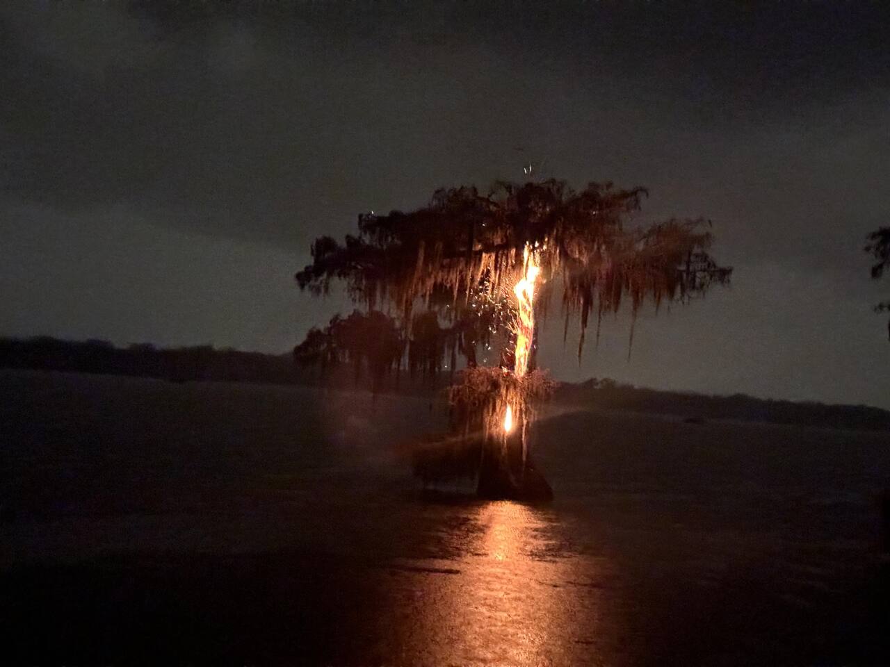 A much-photographed cypress tree at Lake Martin was struck by lightning and burned Friday night.