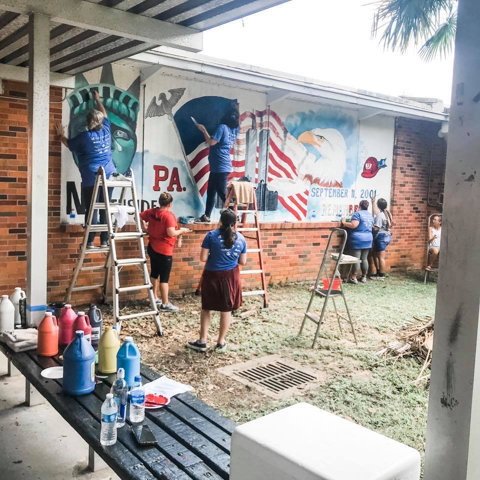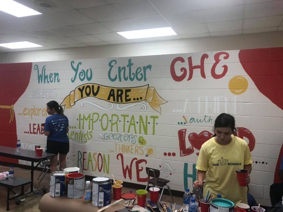 Volunteers repainting the cafeteria wall at Carencro Heights Elementary School