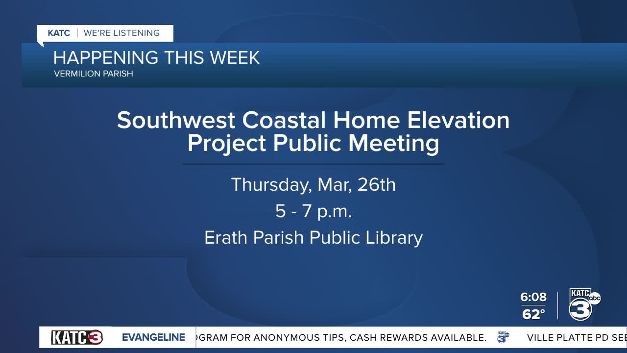A public meeting is set for today to discuss the Southwest Coastal Home Elevation Project. The meeting will take place from 5 to 7 p.m. at the Erath Public Library.