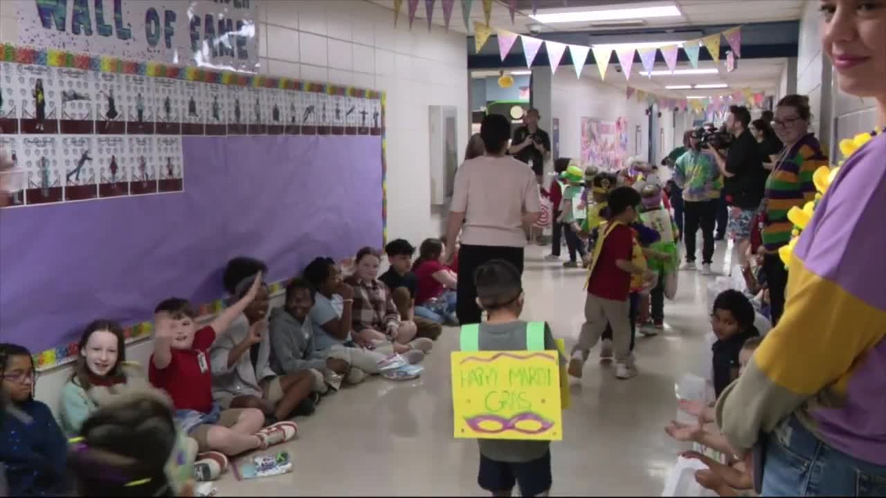 "I love seeing my past students in the hallway, as a kindergarten teacher. I get to see them all growing up, and then, also, just to see the kids get so excited," she said. "We go down the hall with music. They're throwing candy. It's just really exciting to get to go into Mardi Gras break doing this."