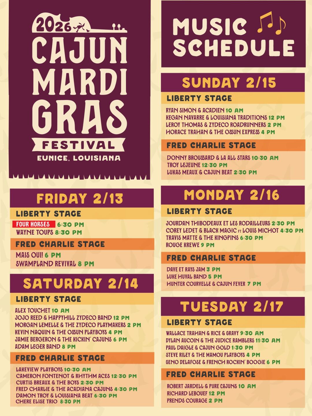 Carnival d’Acadie, Crowley, Louisiana will be held Tuesday, February 17, 2026, and it just got bigger. Join the City of Crowley for their annual Mardi Gras celebration at their new Urban Park & Pavillion. They will have live bands, food and craft vendors and a parade. More Information: www.crowley-la.com