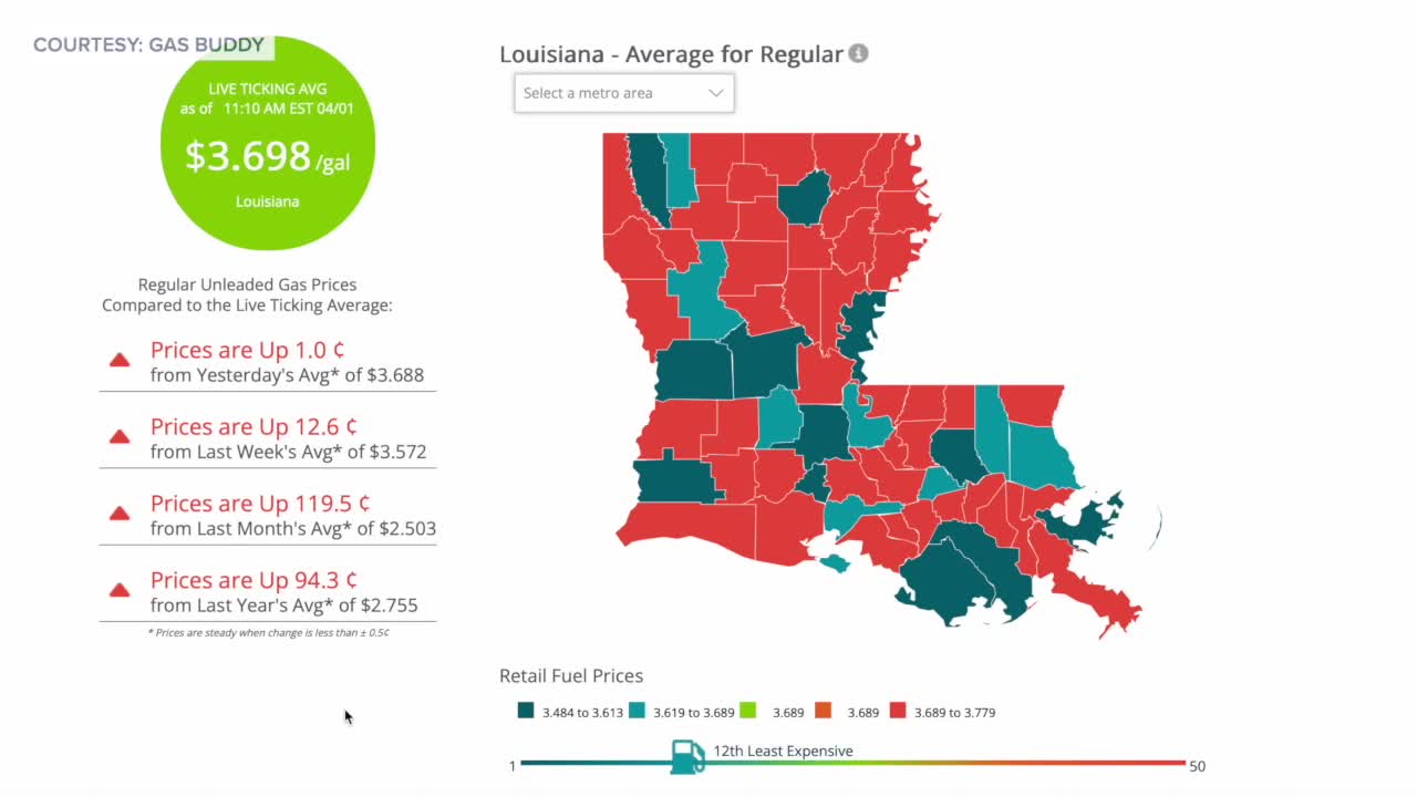 According to GasBuddy, the average price for a gallon of regular gasoline in Louisiana is around $3.70, up roughly 14 cents from the previous week and consistent with the average in St. Martin Parish. The increase comes as more drivers prepare to travel for the holiday weekend.