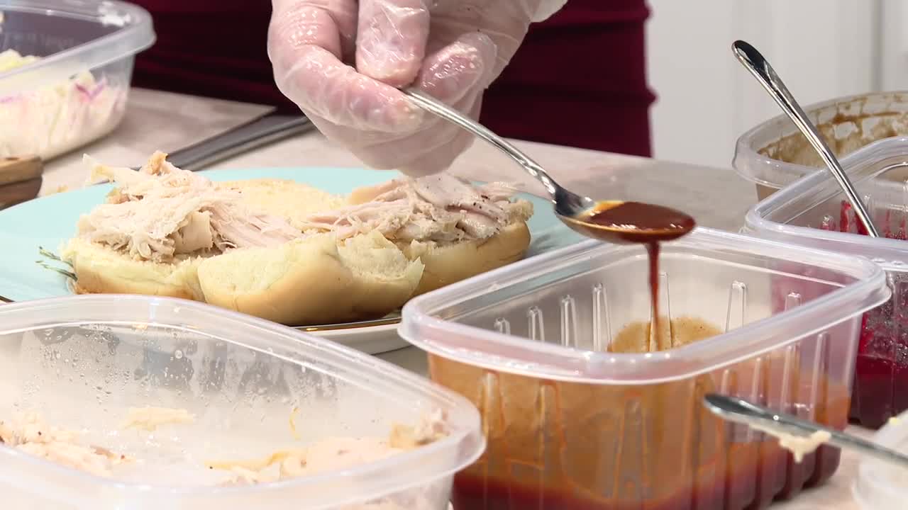 1. On your roll, add a bit of shredded turkey, then BBQ sauce.