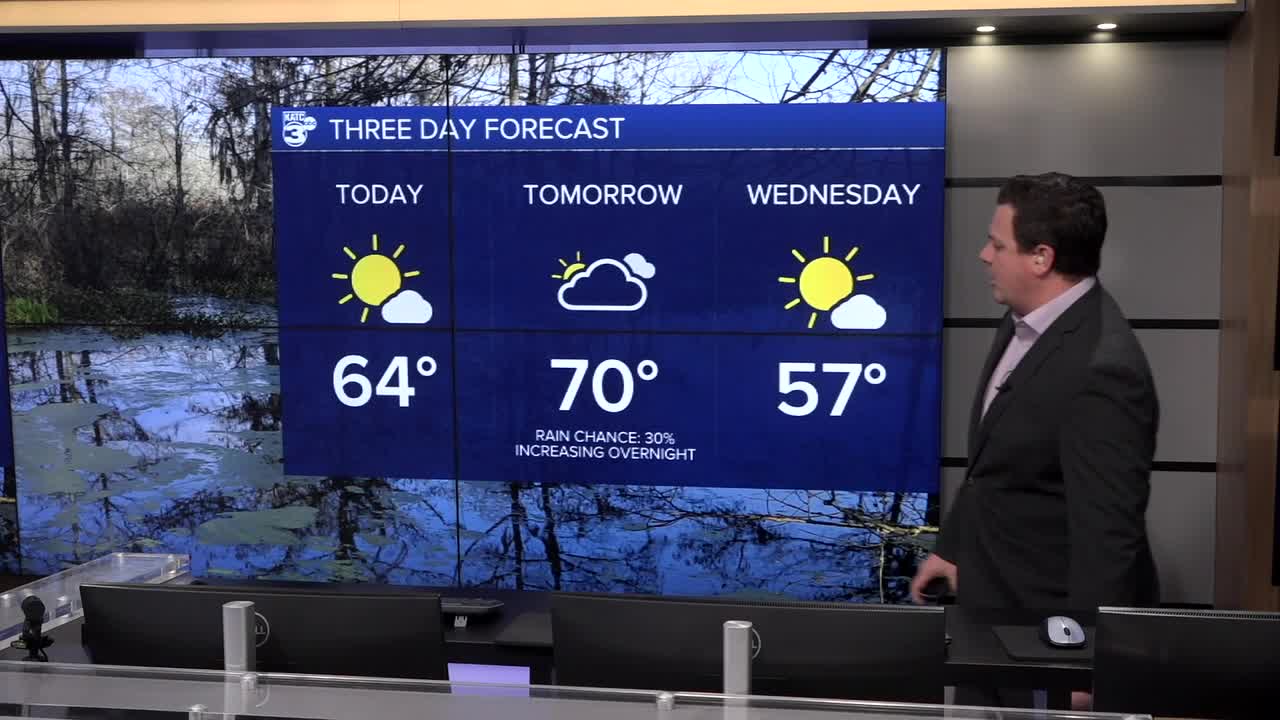 Clouds will build overnight and we won't get the same amount of sunshine on Tuesday ahead of a weak front that's expected to move through Acadiana.