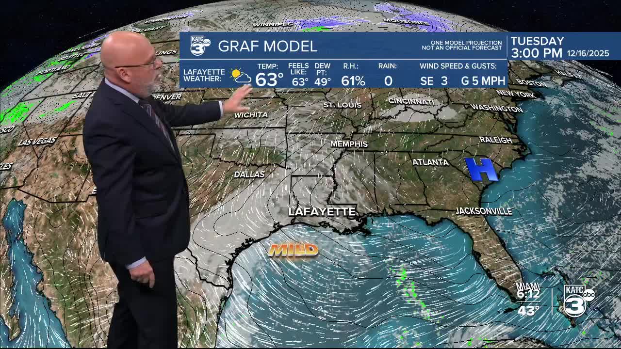 As milder Gulf air continues to "advect" into the region, look for more clouds and patchy light rain, sprinkles, drizzle and or mist to develop toward Wednesday morning with lingering light rain shower activity in the "KATC" forecast through Wednesday afternoon.