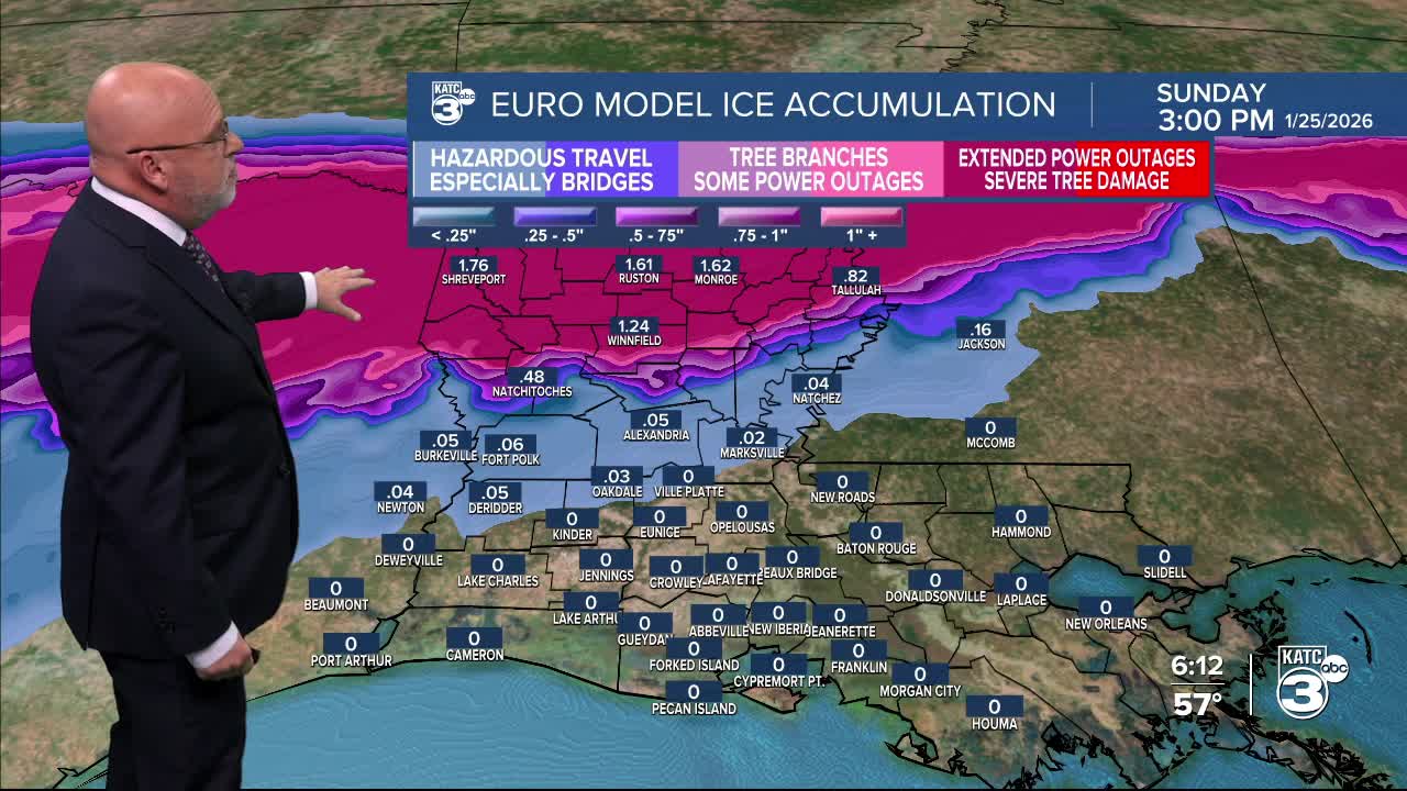 For now, we're not going with any significant ice accumulations in Acadiana, but stay tuned for possible changes as we are on the margin of significant icing that may miss us by less than 100 miles to the north...we'll see if temperatures get cold enough Saturday evening while the precipitation field stays in place. Timing will be everything.