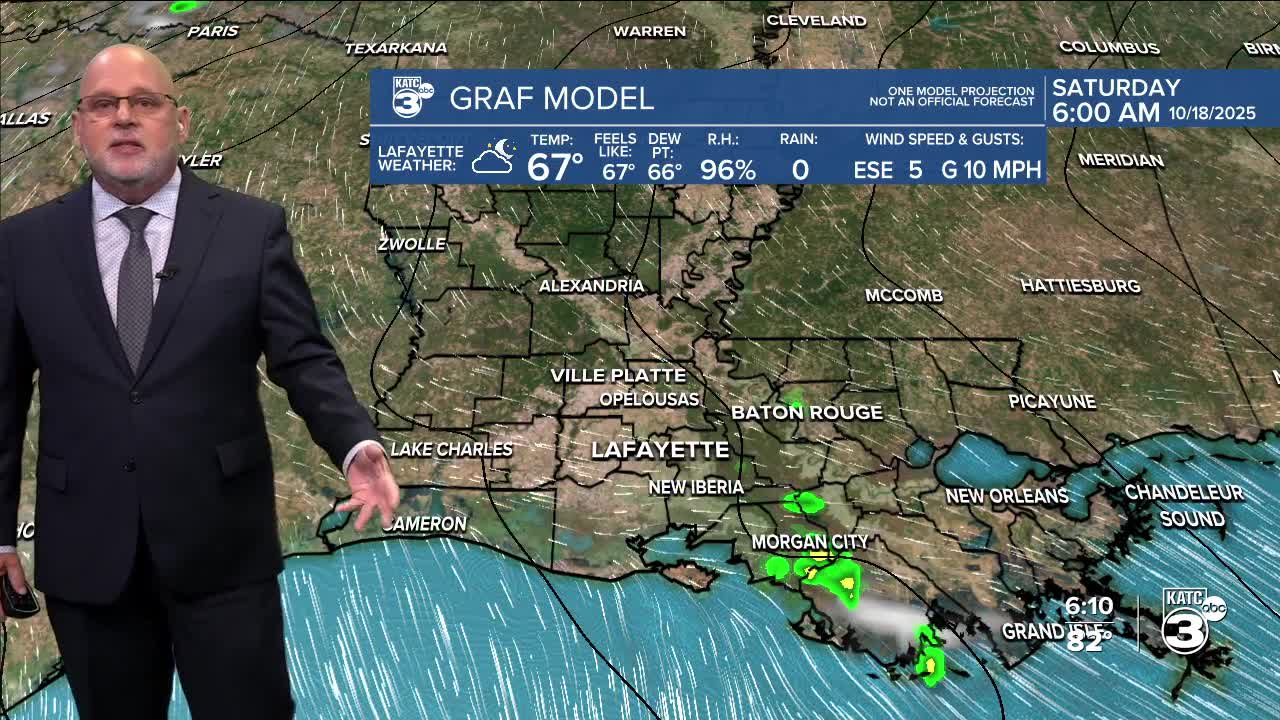 There’s a low-end severe weather threat with this system for areas north of I-10 Saturday through early Sunday. Northern Louisiana is under a slight risk (2/5), while Central Louisiana has a marginal risk (1/5). Isolated severe storms are possible, which include damaging winds, a brief spin-up tornado, or hail. Areas south of I-10 should remain fairly dry.
