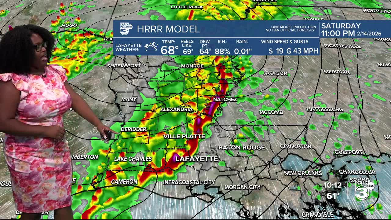 Good news for those celebrating Mardi Gras and Valentine’s Day! The main line of storms won’t move in until late at night, so you can enjoy the festivities. Just keep your rain gear handy, as a few hit-or-miss showers may pop up during the day along with some breezy conditions.