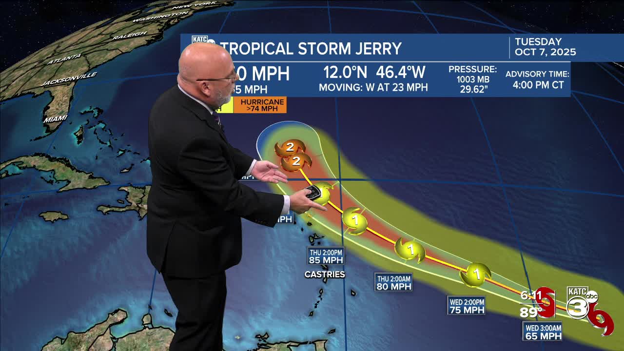 Meanwhile the tropics are still alive, with newly formed Tropical Storm Jerry forming in the mid-tropical Atlantic...this system will be no threat to the Gulf.