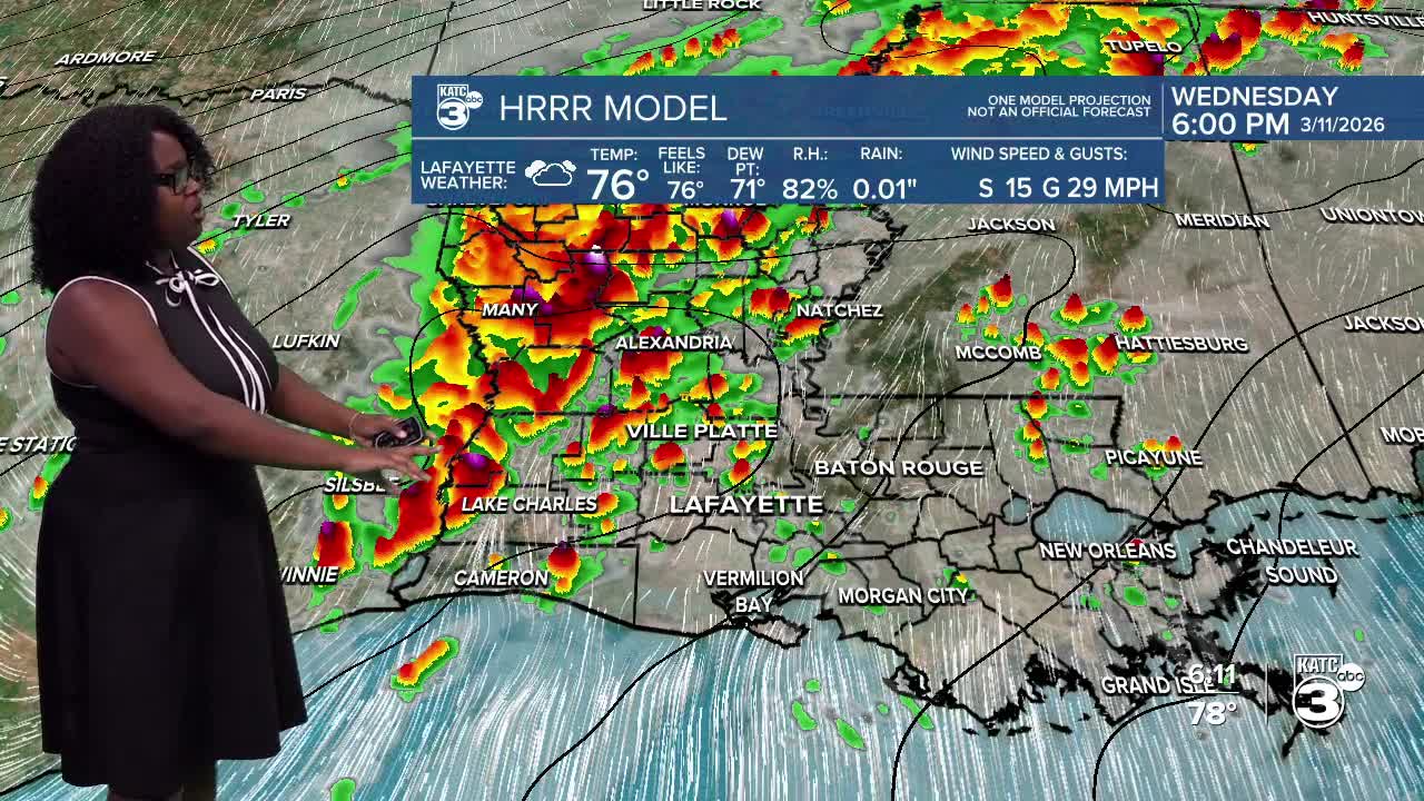 TIMING: A line of storms has developed, producing gusty winds and heavy rain in eastern Texas. Expect the storms to reach Beauregard and Calcasieu in the next hour or two. They’ll make their way to Acadia and Evangeline by 7 PM, move over Lafayette around 8 PM, and exit St. Mary before midnight.