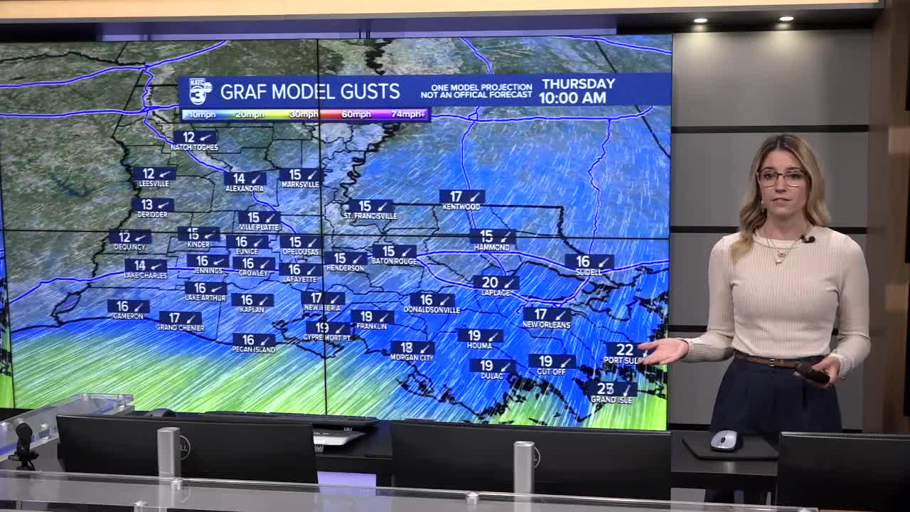 Acadiana, we are waking up to chilly temperatures this morning as a secondary cold front moves across the region. No rain associated with this one, just lots of wind. Northerly winds are already picking up, with gusts expected to reach 20 to 25 miles per hour through the morning and afternoon. Skies remain mostly sunny with a few lingering clouds, and no rain is expected today. A wind advisory may be issued later so securing loose outdoor items is a good idea, we don't want to see your inflatable turkey flying to the neighbors house before Thanksgiving tomorrow.