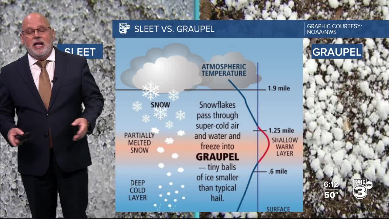 In today's case, the graupel started as snow (which usually falls at 8-12 feet in most winter weather scenarios, and for us, usually melts before even getting close to the ground) that fell through a warmer and drier atmospheric dry layer at roughly 5,000 feet.