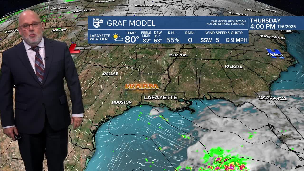 Thereafter, look for the chilliest weather of the fall season with highs struggling to get out of the 50s Monday while nighttime/morning lows could drop to near the "frost zone" in the low-mid 30s for portions of the Acadiana area Monday night into Tuesday morning.