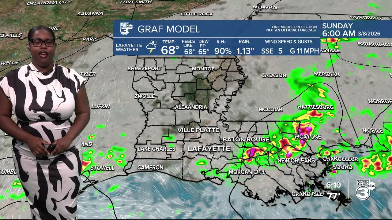 Saturday looks mostly dry, but a few streamer showers and storms can be expected. Keep the umbrella nearby! The main line of storms is expected to move in late Saturday, just before midnight for our western parishes, and will continue to sweep through the rest of Acadiana until around 4 or 5 AM, exiting St. Mary Parish. Timing may vary slightly depending on the speed of the storms.