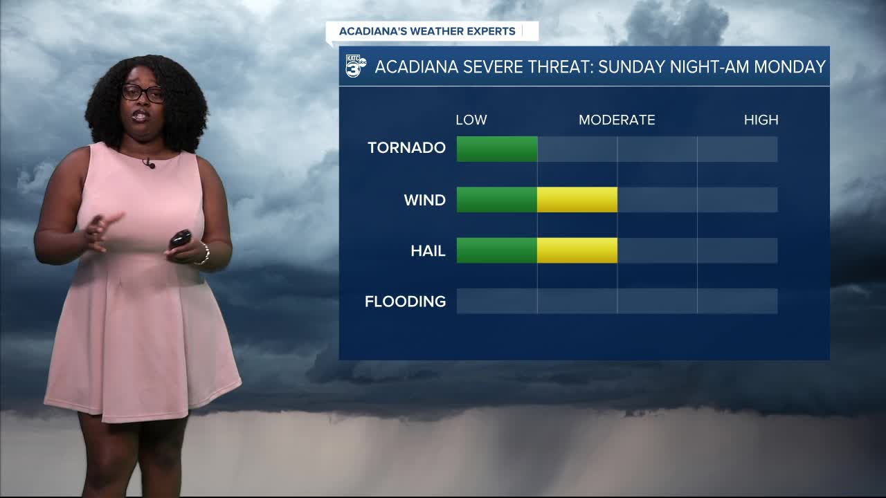 TIMING: Most of Sunday will be dry; however, expect the storms to start moving in around 7 or 8 PM over Alexandria. By 8 or 9 PM, they’ll shift towards Allen and Evangeline Parishes. The storms should be over Lafayette around 10 or 11 PM, with them clearing St. Mary Parish around midnight.