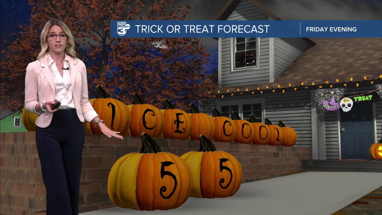 Halloween night will be cool, clear, and nice! All treats, no tricks here. Lows will fall from the 60s near sunset to the mid 50s through the overnight, so if you'll be out for the night, plan on temperatures dropping steadily after sunset after daytime high temperatures rise to the 70s. Sunset will occur Halloween night around approximately 6:22 PM.